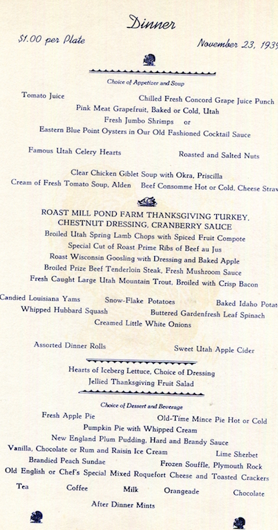 USA Utah Salt Lake City Menu Hotel Utah Thanksgiving 1939 Front