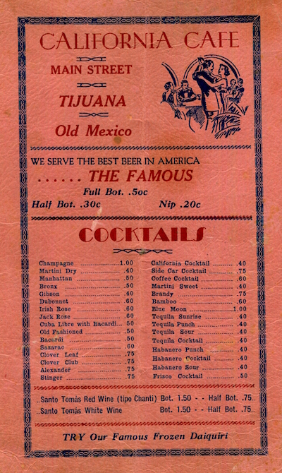 Mexico Tijuana Restaurant California Cafe Menu 1940 Front