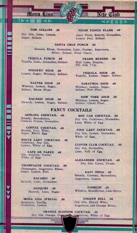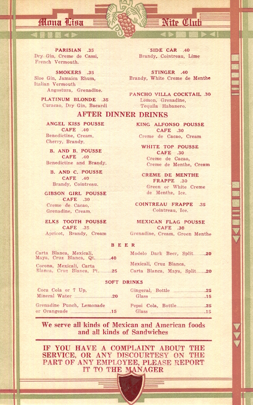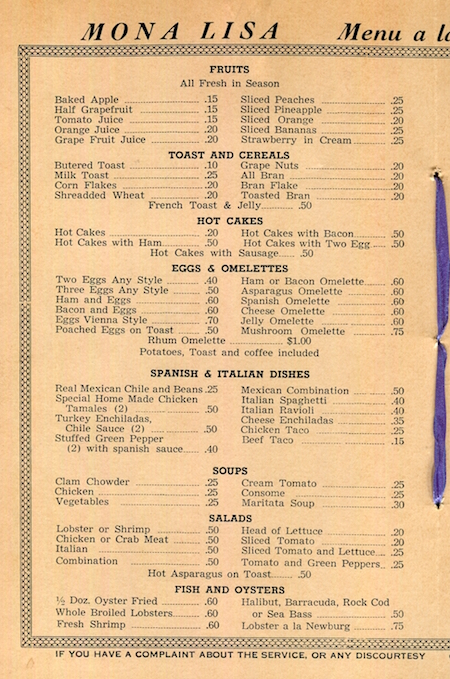 Mexico Tijuana Restaurant Mona Lisa Menu 1939 Inside 8