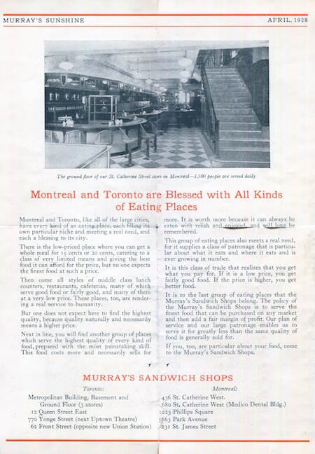 Canada Toronto Brochure Mur Rays Sandwich Shop 1928 Inside