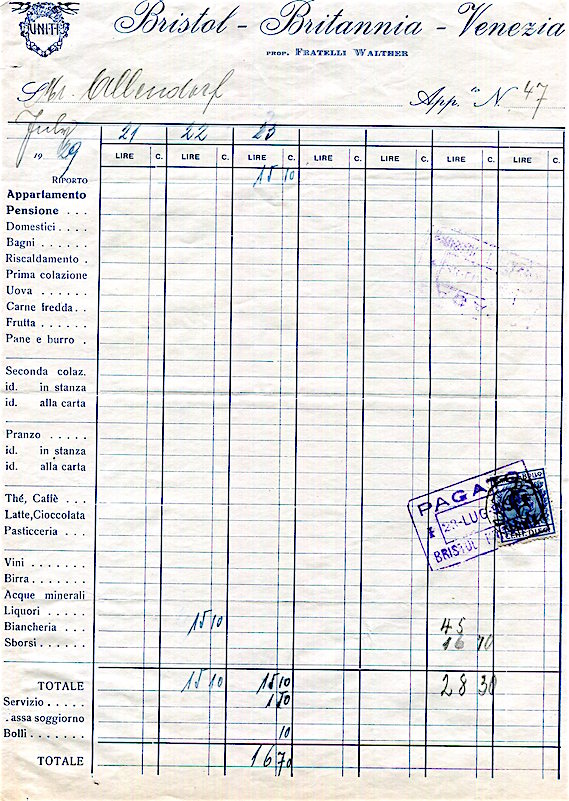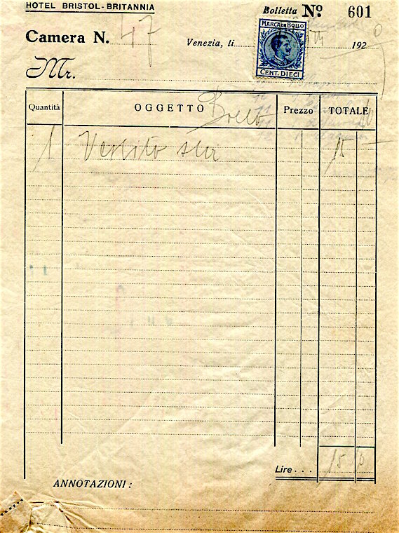 Italy Venice Hotel Bristol Britannia Receipt 1929-2