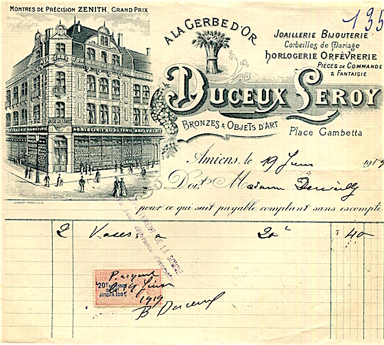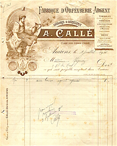 France Amiens Commerce A Calle Receipt Silver Jewerly Cutlery 1910
