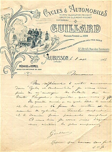 France Aubusson Commerce Guillard Letter Cycles Auto 1913