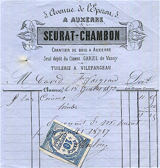 France Auxerre Commerce Seurat Chambon Receipt 1872
