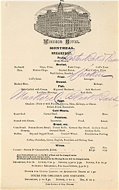 Canada Montreal Windsor Hotel Breakfast Menu 1882