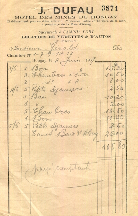 Cambodia Hotel Receipt Hon Gai Des Mines 1939