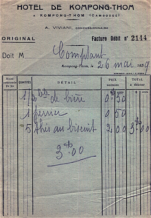 Cambodia Kompong Hotel Receipt Thom De Kompong Thom 1939