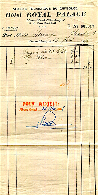 Cambodia Phom Penh Hotel Receipt Royal Palace 1938