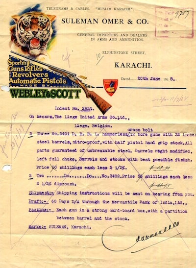 India Commerce Karachi Suleman Omer Co Receipt Sporting Guns 1928