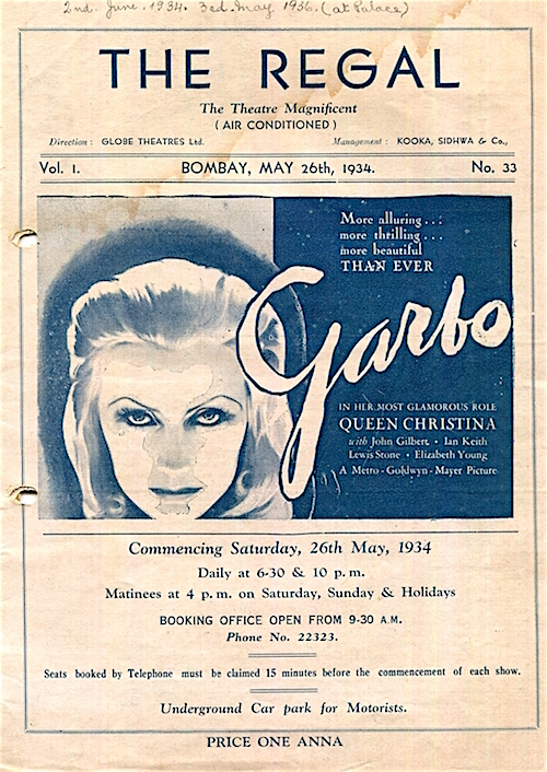 India Bombay Entertainment The Regal Movie Theater Program Garbo 1936