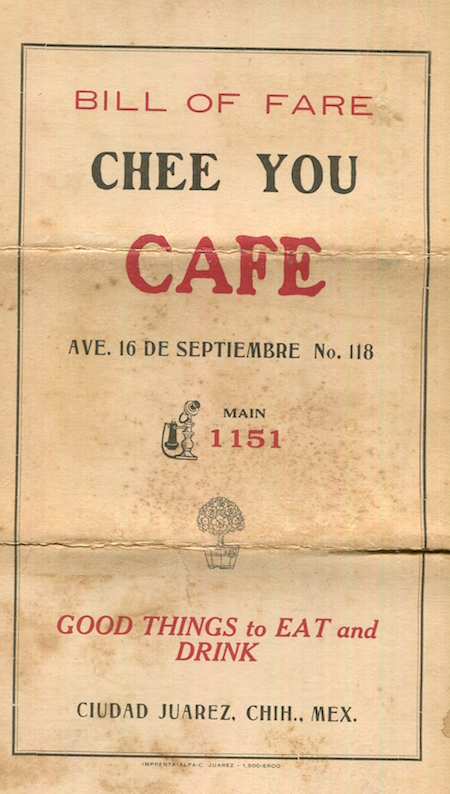Mexico Juarez Restaurant Chee You Cafe Menu 1922 Front