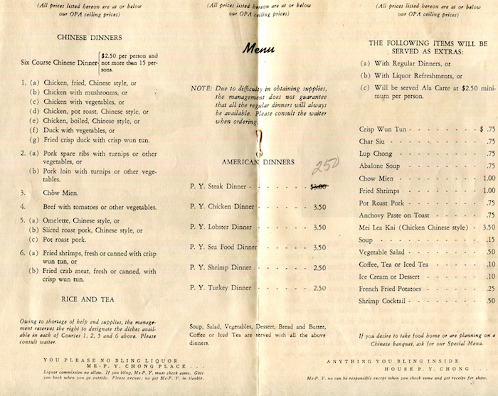 Hawaii Honolulu Restaurant House Of PY Chong Menu 1943 Inside 3