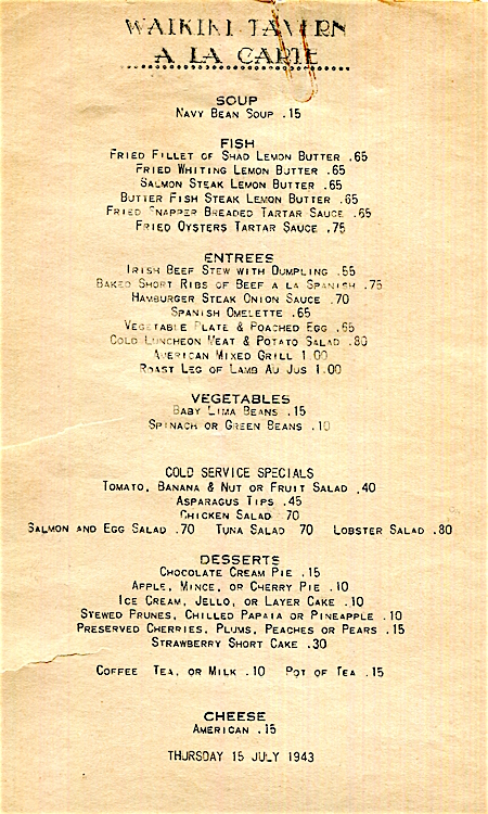 Hawaii Honolulu Restaurant Waikiki Tavern Menu 1943 Back