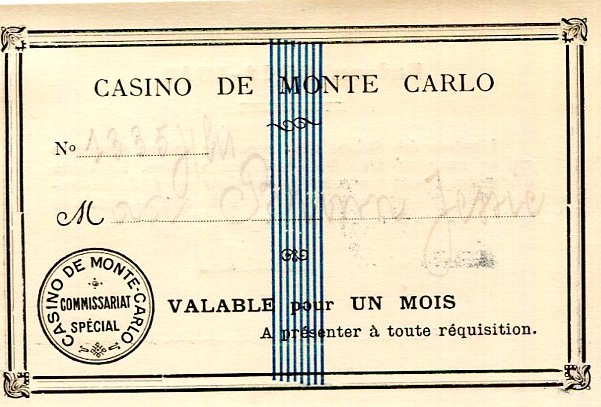 Monaco Monte Carlo Entertainment Casino Entry Card 1924 Side Two