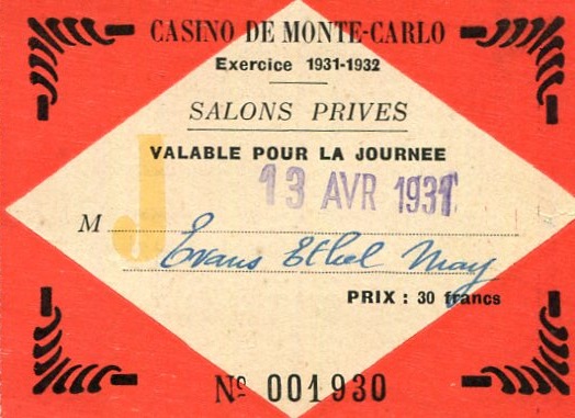 Monaco Monte Carlo Entertainment Casino Entry Ticket 1931 Side One