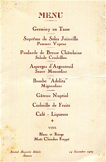 Monaco Monte Carlo Hotel Bristil Majestic Menu 1929 Front