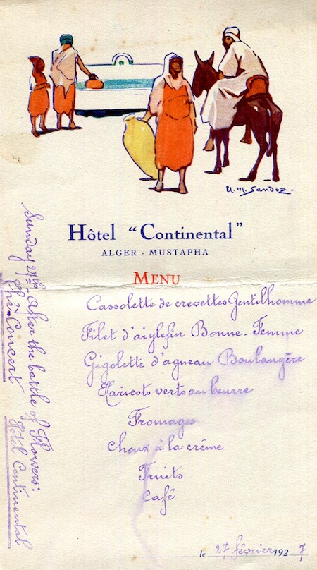 Algeria Algiers Hotel Continental Menu 1927 Front