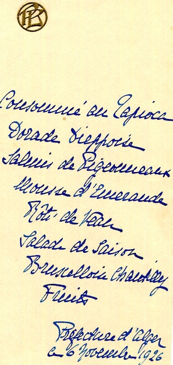 Algeria Algiers Special Occasion Menu 1929