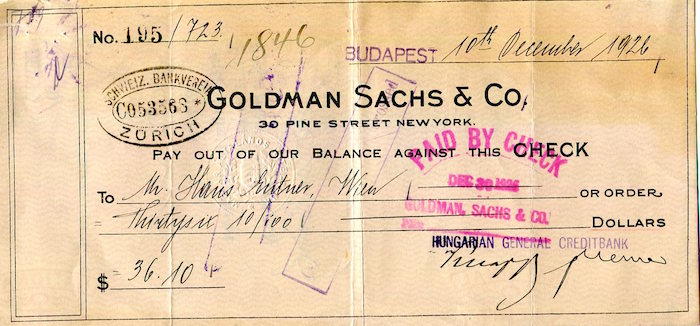 Hungary Budapest Commerce Goldman Sachs Co Check 1926