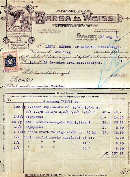 Hungary Budapest Commerce Varga Weiss Receipt Paper Dealers 1912