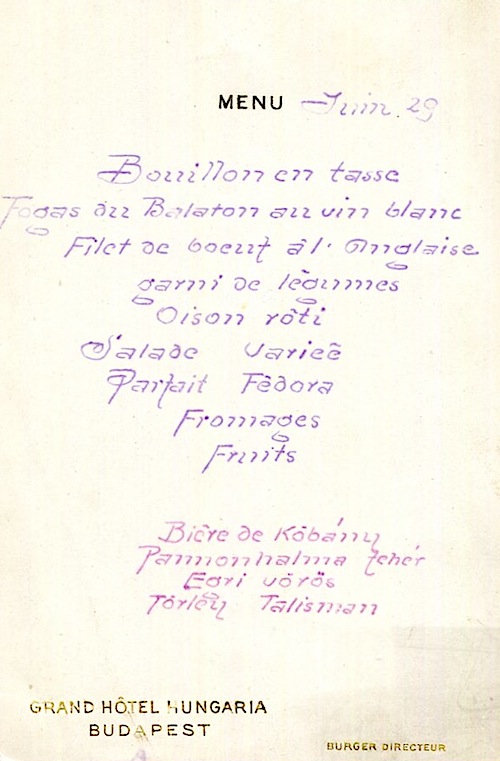 Hungary Budapest Grand Hotel Hungaria Menu 1929-1
