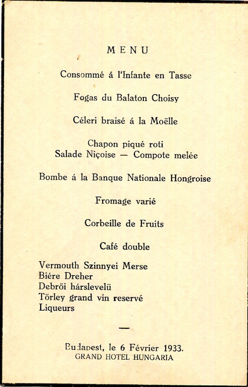 Hungary Budapest Grand Hotel Hungaria Menu 1933-1