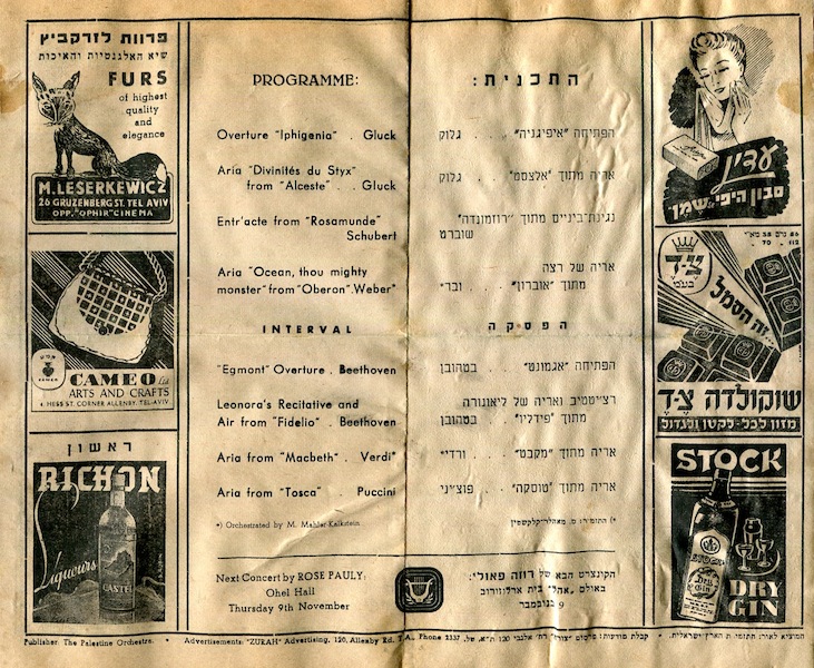 Palestine Entertainment Palestine Orchestra Tel Aviv Program 1944-6 Front