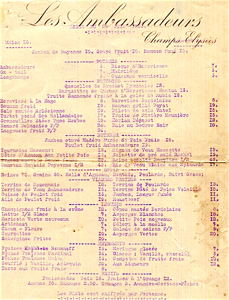 France Paris Menu Ambassadeurs 1924