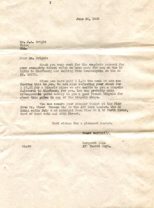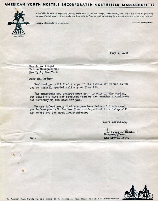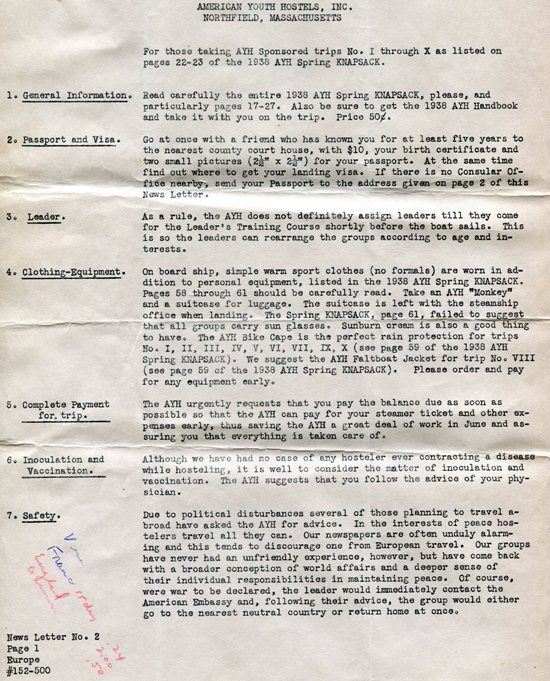 United States Travel Agency AYH Itinerary 1938 Letter No. 3