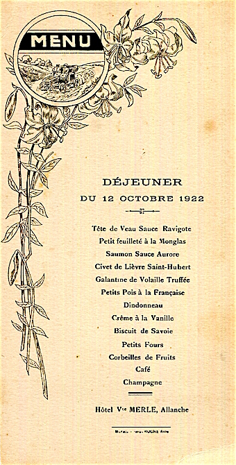 France Allanche Hotel V Merle Menu 1922
