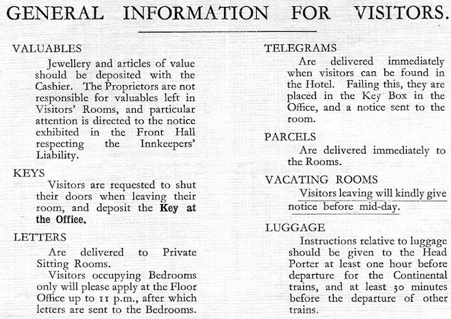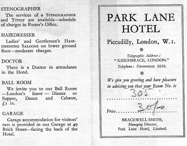 England London Park Lane Hotel Room Card 1927 Back