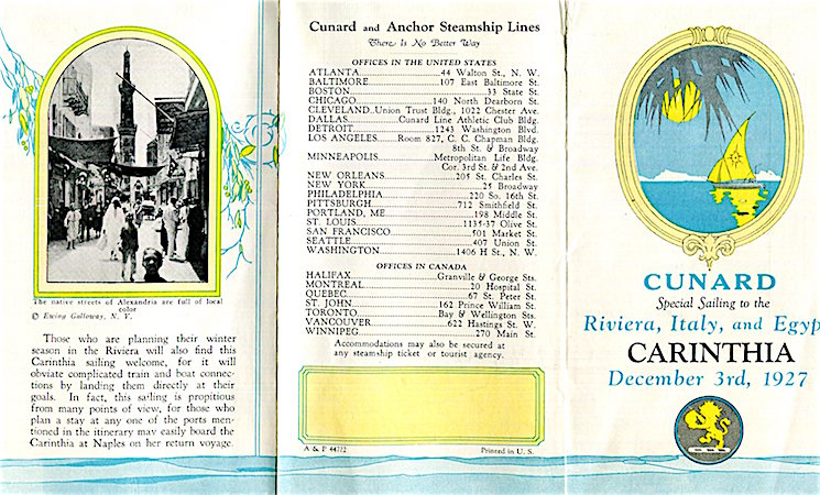 England Transport Steamship Cunard White Star Line SS Carinthia Brochure Riviera Italy Egypt 1927