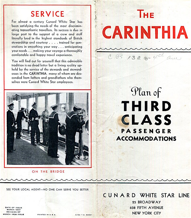 England Transport Steamship Cunard White Star Line SS Carinthia Brochure Third Class Room Plans 1938