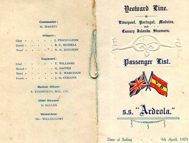 England Transport Steamships Yeoward Line SS Ardeola Passenger List 1929 Front
