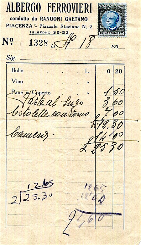 Italy Piacenza Albergo Ferrovieri Restaurant Receipt 1932