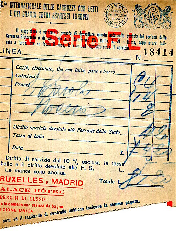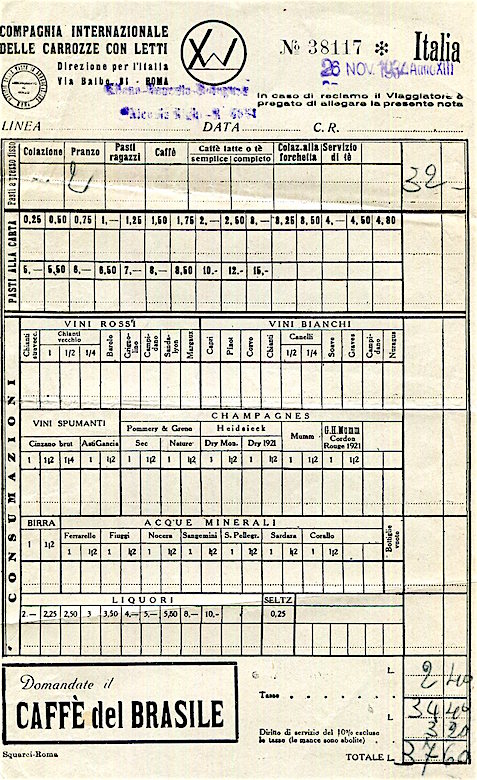 CIWL Italian Railroads Dining Car Receipt 1934-3