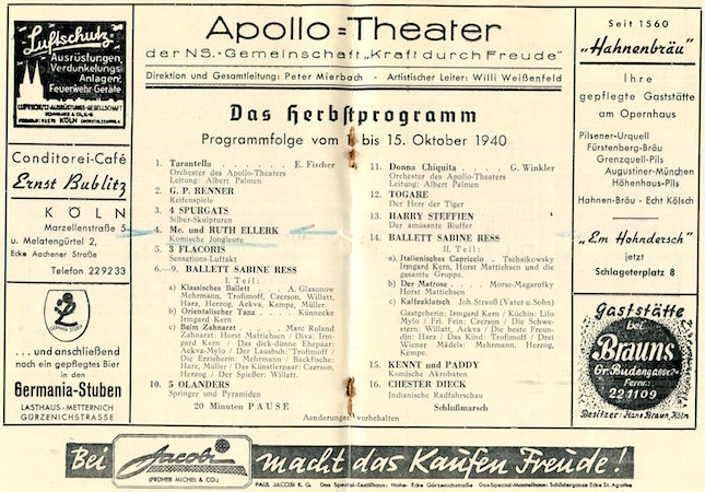 Germany Entertainment Cologne Apollo Theater Program 1940 Front