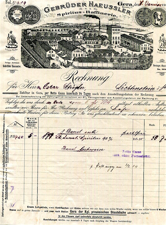 Germany Commerce Gera Gebrüder Hauessler Receipt Manufacture Of Spirits 1904