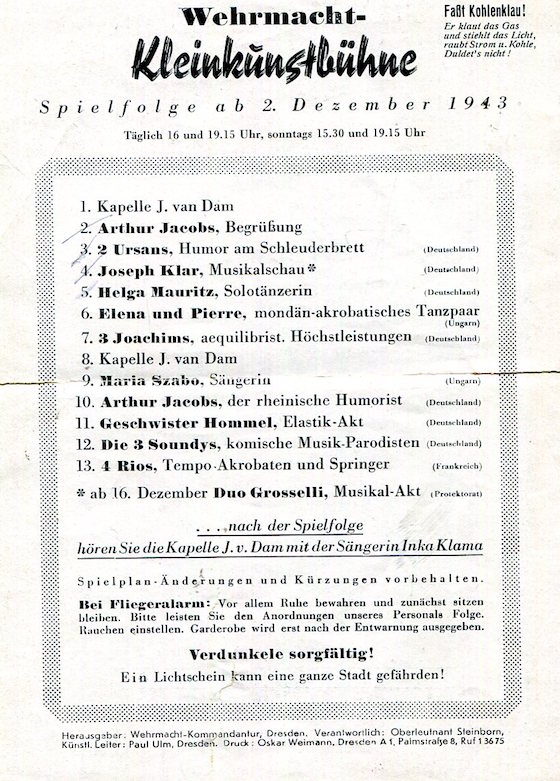 Germany Entertainment Dresden Wehrmacht Kleinkunstbühne Program 1943 Back