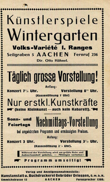 Germany Entertainment Aachen Wintergarten Program 1922 Front