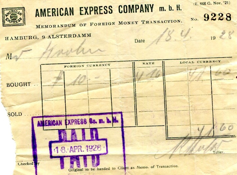 Germany Commerce Hamburg Currency Receipt American Express 1928