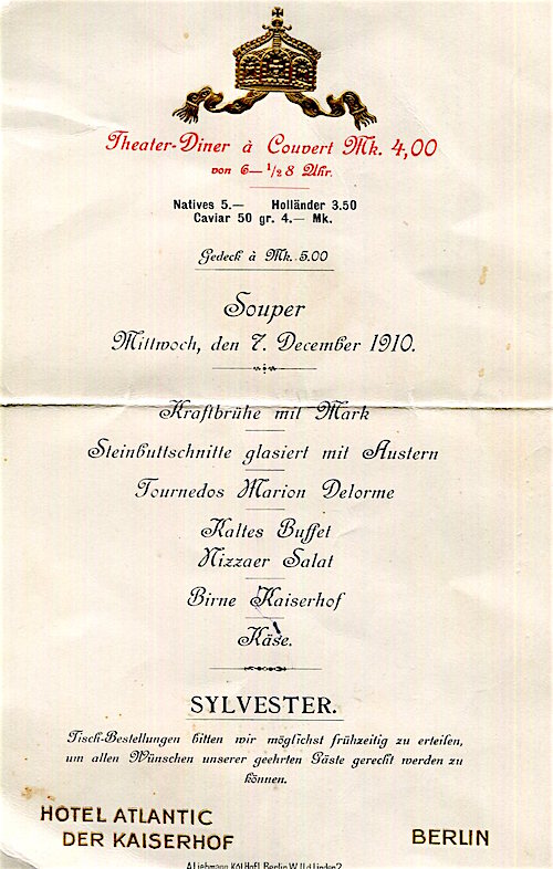Germany Berlin Hotel Atlantic Der Kaiserhof Menu 1910