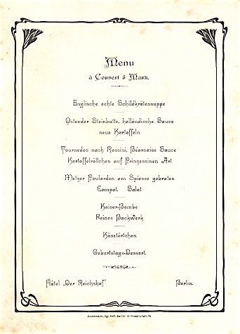 Germany Berlin Hotel Der Reichshof Menu 1903 Back