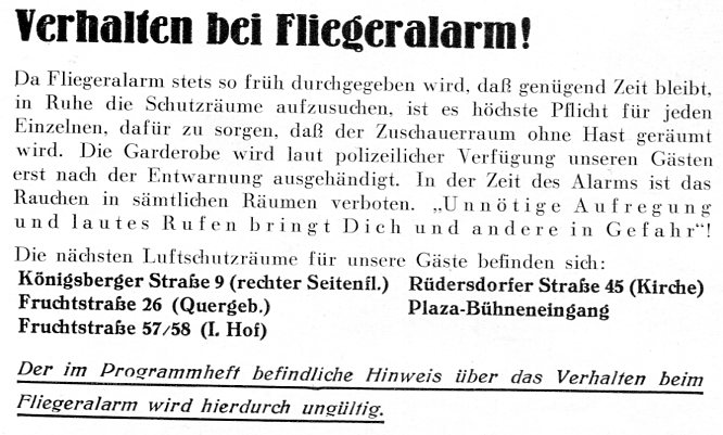 Germany Berlin Entertainment Plaza Variety Air Raid Instructions Leaflet 1940