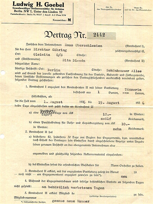 Germany Berlin Entertainment Contract Dancer Dita Bionda 1936