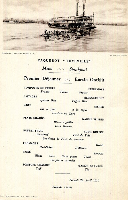 Belgium Transport Steamship CMB SS Thysville Menu 1939