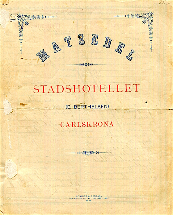 Sweden Carlskrona Hotel Stadshotellet Menu 1896 Inside 1
