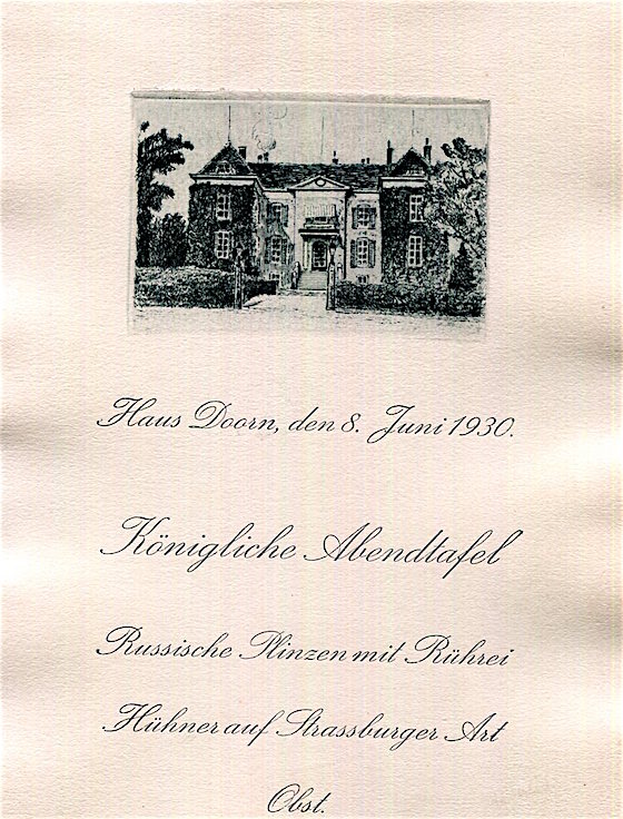The Netherlands Royalty Doorn Haus Doorn Menu 1930-1