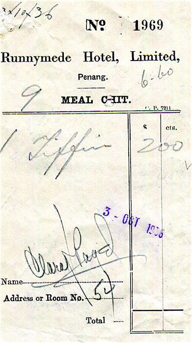 Straits Settlements Penang Runnymede Hotel Meal Chit 1936