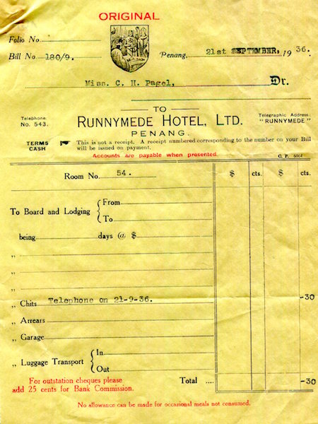 Straits Settlements Penang Runnymede Hotel Receipt Trunk Line Call 1936